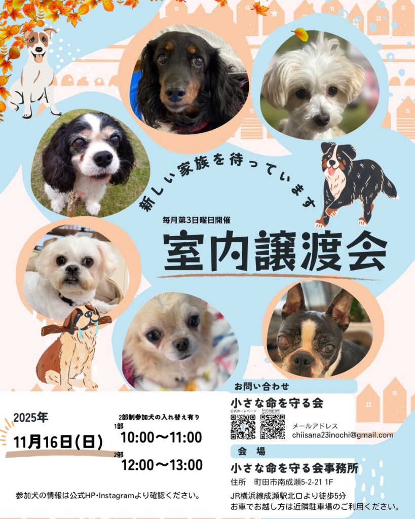 11月16日(日) 室内譲渡会@小さな命を守る会事務所 開催のお知らせ📢
