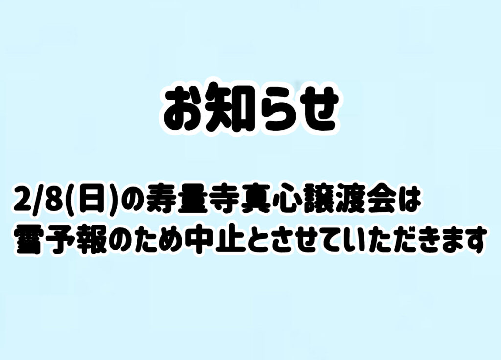2/8(日)譲渡会 中止のお知らせ 2026 2/07 活動ブログ 2026年2月7日 2/8(日)の譲渡会は雪予報のため、安全を優先して中止とさせていただきます。 事務所でのお見合いを受け付けております。 気になる子がいる方は譲渡条件をご確認の上、下記申し込みフォームよりご連絡をお願いいたします。 里親申し込みフォーム 活動ブログ お知らせ よければシェアしてください! 募金をいただきました 関連記事 -2月15日(日) 出張譲渡会開催のお知らせ – 2026年1月22日 1/25(日) 寿量寺真心譲渡会 参加一覧 2026年1月20日 1/11(日) 寿量寺真心譲渡会 参加一覧 2026年1月10日 トイプードルのコットン 医療費支援のお願い 2026年1月2日 チワブルのニコ 経過ご報告 2026年1月2日 2026年しあわせ保護犬カレンダー 好評販売中です 2025年12月19日 チワブルのニコ 手術成功のご報告 2025年12月18日 12月21日(日)室内譲渡会開催のお知らせ 2025年12月17日
