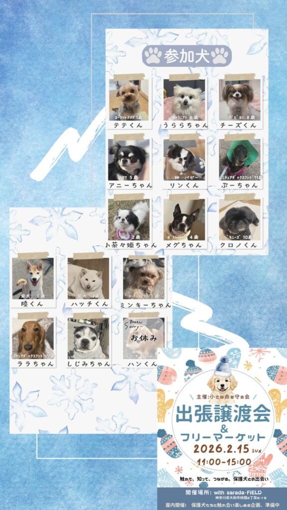 会場には多くの方に足をお運びいただき、保護犬たちに優しく声をかけてくださいました。実際に触れ合っていただくことで、それぞれの子の個性や魅力を感じていただけたのではないかと思います。なお、今回お休みだった子たちは会場に保護犬カードを掲示しご紹介させていただきました。参加できなかった子たちにも目を留めていただき、本当にありがとうございました。